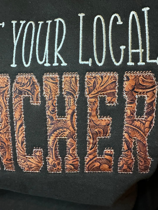 Support your local rancher embroidered crewneck sweatshirt with tooled leather cotton fabric
